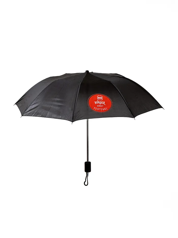 Černý skládací deštník s červeným logem Burger Street Festivalu. Lehký, skladný a vždy po ruce – protože pravý fanoušek jde na burger za každého počasí.