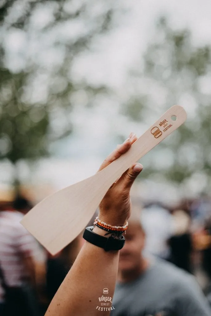 Dřevěná obracečka. Vypálené logo BURGER STREET FESTIVAL.