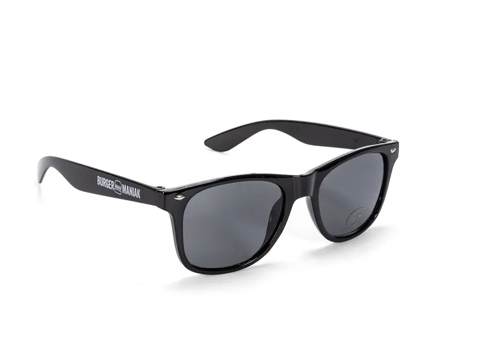 Černé plastové sluneční brýle s bílým potiskem Burger maniak na nožičkách. UV ochrana 400, pohodlné a cool – ideální doplněk pro každý festivalový den.