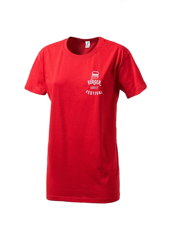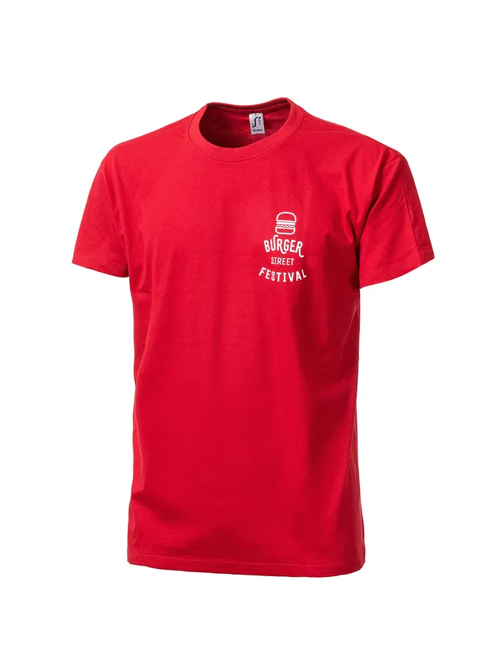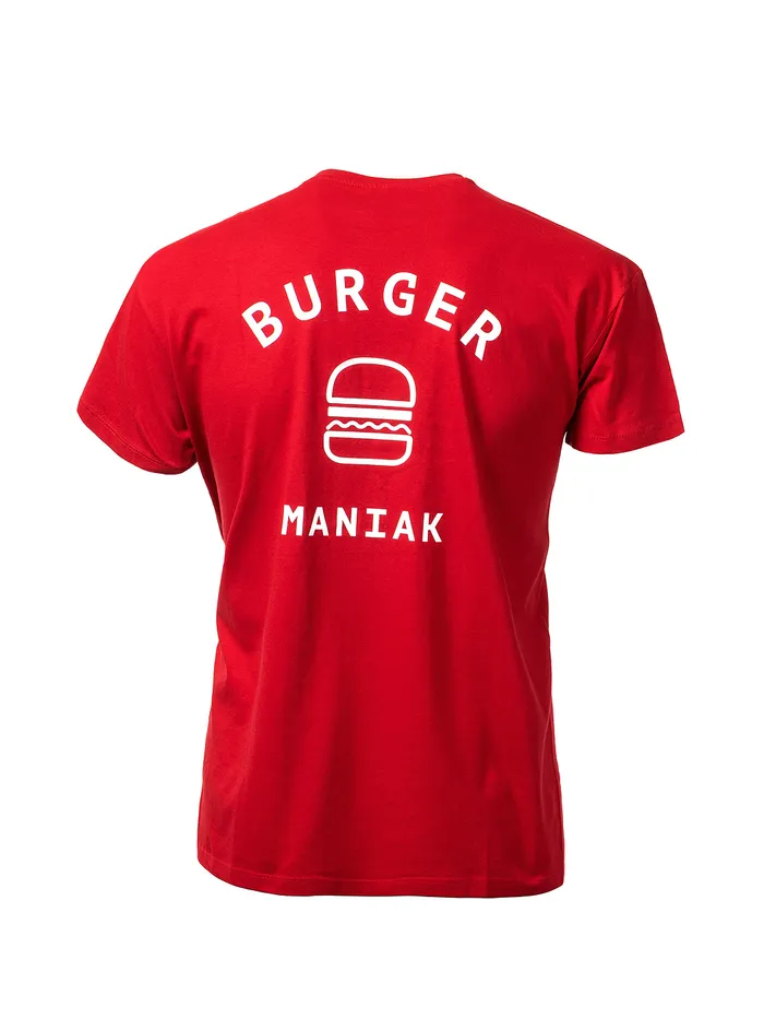 Červené triko s bílým potiskem Burger maniak, dostupné v různých velikostech pro pány i dámy. Pohodlné, stylové a jasně říká, kdo ví, kde chutná nejlíp.