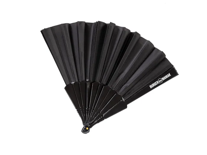 Černý vějíř s bílým potiskem Burger maniak – praktický, lehký a vždy po ruce, když teplo stoupá. Stylový doplněk pro každý festivalový den.